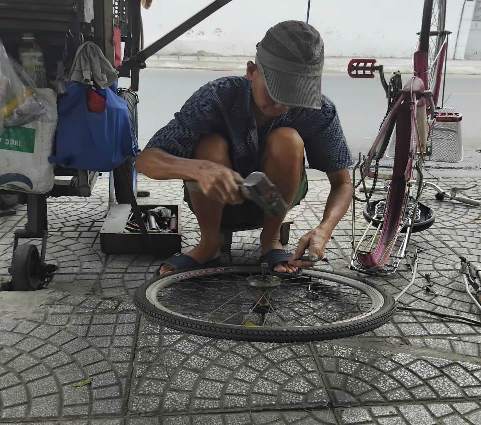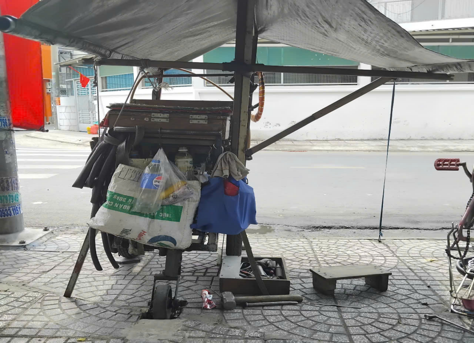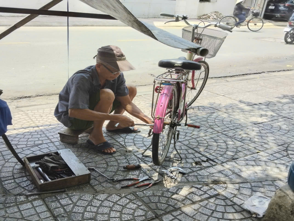 Tính đến ngày hôm nay, chú đã gắn bó với nghề được 25 năm. Ngồi đây với hộp đồ nghề đơn sơ, chú ví mình như người đang đi thả câu. Nếu ngày nào có khách thì còn được thoải mái, ngày nào không có khách thì “liệu cơm mà gắp mắm”. Chú tâm sự: “có ngày dọn đồ ra ngồi hoài từ sớm tới tối cũng không có một khách nào, tối đến lại dọn dẹp đi về”. Những khách hàng của chú chủ yếu là thủng lốp, cần bơm hay vá bánh xe mà thôi. Thỉnh thoảng mới có người đến để sửa xe máy hay xe điện.